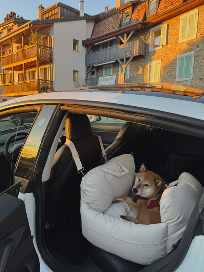 À l’intérieur, un coussin réversible permet à votre chien de choisir entre une face en fausse fourrure chaleureuse ou un textile mat plus frais. Un confort ajusté à chaque saison. Léger mais isolant, le Puffer Car Seat se transforme naturellement en siège auto sécurisé pour chien, en lit de voyage ou en sac de transport élégant, réunissant esthétique et praticité dans un design épuré.